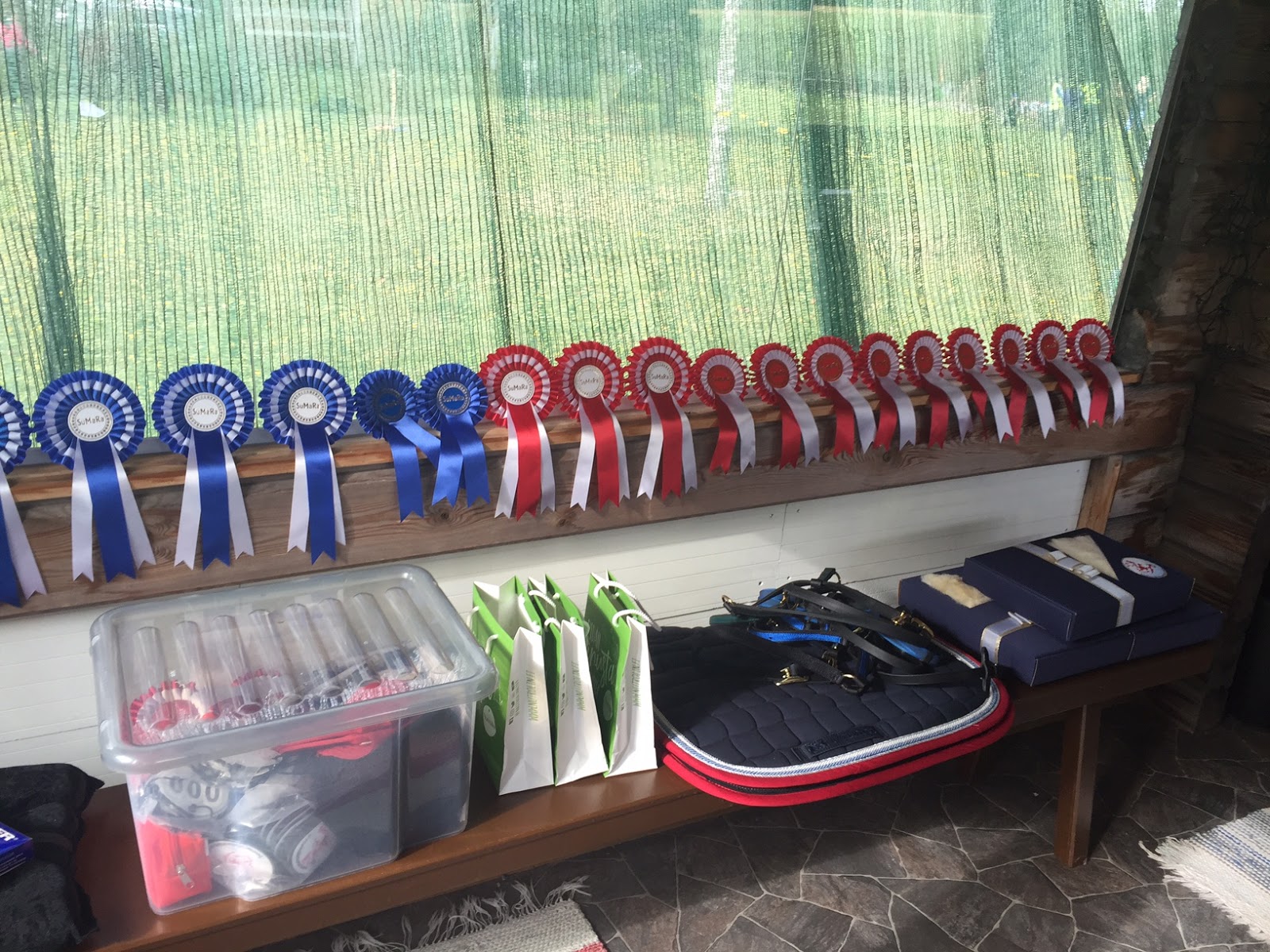 Sunnuntaiaamuna kello soi kuudelta, aamupalat naamaan ja kisakeskukselle. Minna lähti hoitelemaan hevostarkastusta ja minä ja Kaija laitoimme kanslian kuntoon ja otimme ilmoittautuneita vastaan. Kellotkin saatiin kuosiin kun Heidi saapui stewardoimaan ja toi käyttöohjeen.